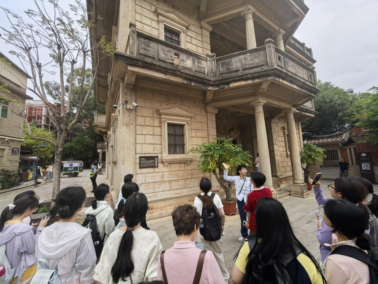 下午3时,师生一行抵达被誉为“华侨建筑博物馆”的晋江梧林古村落。这里坐落着136栋百年华侨历史建筑,每一栋洋楼、番仔楼背后,都镌刻着华侨华人远渡重洋、心系桑梓的感人故事。